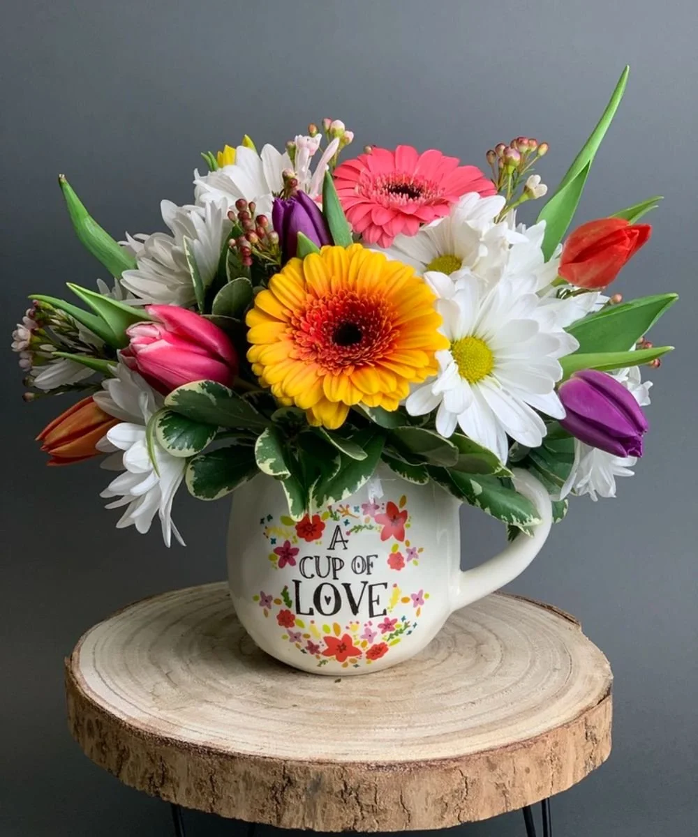 Designers choice of seasonally available fresh flowers arranged in lasting keepsake mugs, classic vases, warm rustic baskets, or modern chic boxes; ready-to-display beauty.
